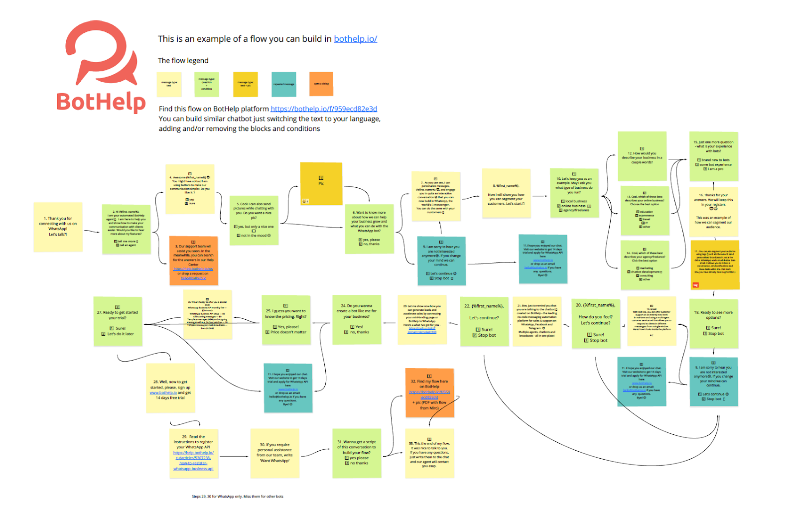 On this diagram, messages are marked in different colors, to which one or another message type is applied on the BotHelp platform. Yellow blocks are regular messages. Green are questions with conditions, with the answers depending on which direction the dialogue will go further. These marks will help you reproduce the funnel on BotHelp.