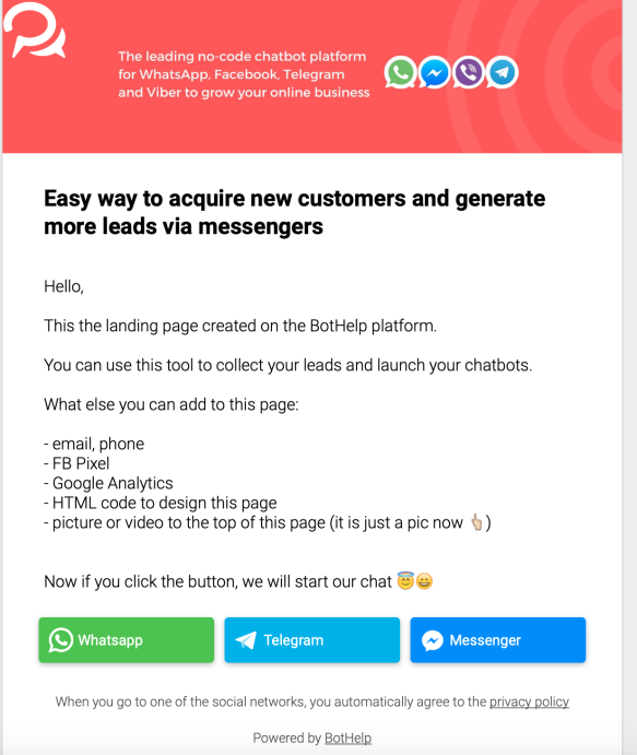 Then, decide on the messengers that you will use to communicate with the audience. You can connect with one, two or on any messenger that is popular in your country: Facebook*, Telegram, Viber or WhatsApp.