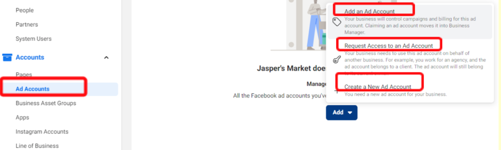 In the Business Manager, you can add ad accounts owned by you or request access for other people or business Ad accounts. You can also create a new Ad account if you don’t have one.