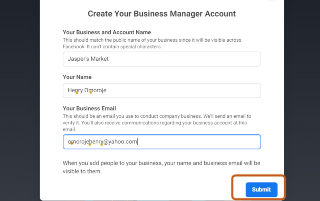 STEP 2: Once you click on the “Create Account” button, a new dialogue box will open that presents you with a form to fill in your basic information. Insert your business name, full name, and email. Then click on the “Submit” button