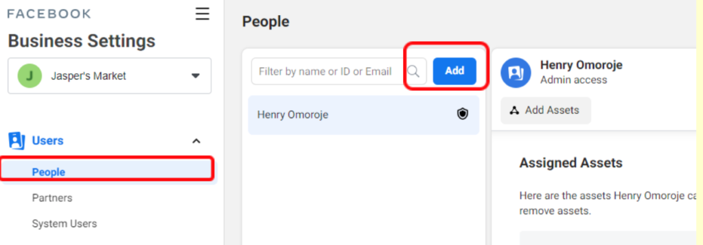 Now that we have added Ad account, let’s add people and grant them fine-grained access control to our business manager’s assets. Remember that this comes with an Admin privilege, and only the admin can add people to the Business manager. Also, don’t add people if you don’t trust them.