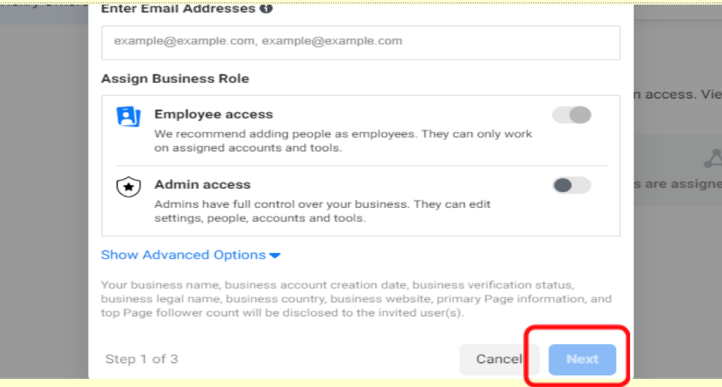 When you click on the “Add” button, a dialogue box will display, giving you options to select the role to assign them. You will be given either “Employee” or “Admin.” Access. By default, Facebook* will recommend “Employee” access. You can choose “Show advance” for more access options. Provide the employee email address (not necessarily their personal email. It can be a business email address). Choose the access role and click “Next.”