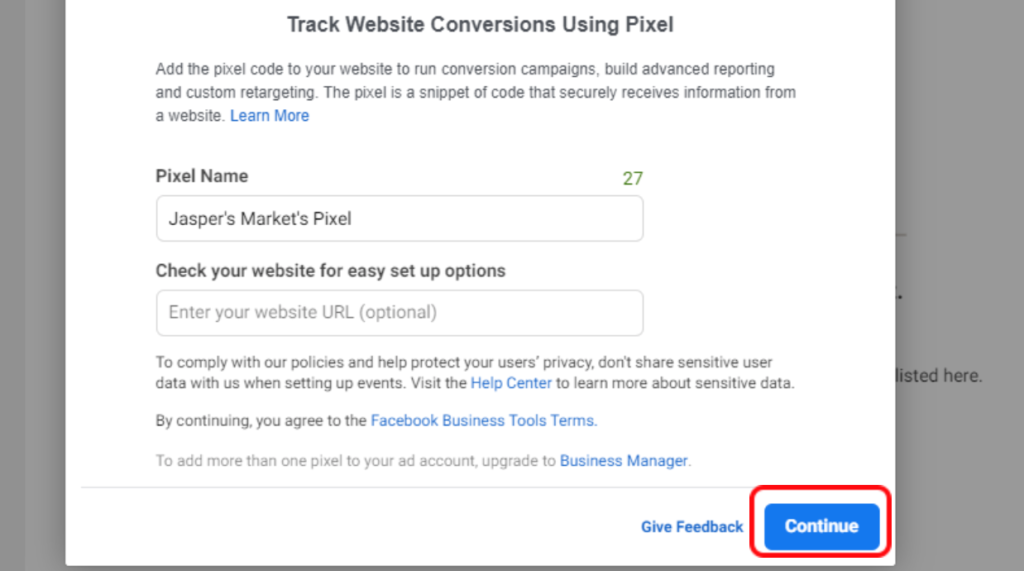 Enter the name of the pixel => Enter website URL => Click “Continue”