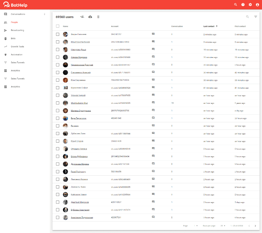 Administre sua lista de contatos em diferentes plataformas de mensagens e edite os dados do seu perfil. Utilize filtros, exporte e importe assinantes.