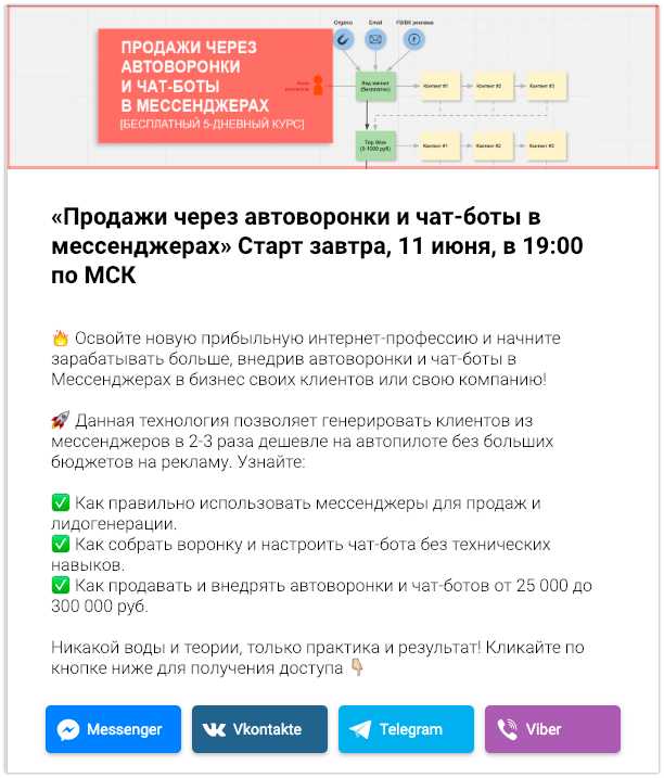В день трансляции вам необходимо отправить несколько сообщений с напоминанием о предстоящем вебинаре и одно после завершения.