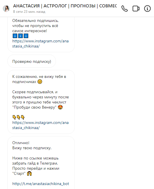 К Хохловой Екатерине обратилась астролог, она активно начала развивать свою страничку в Инстаграм* и ей нужно было автоматизировать выдачу лид-магнита и сделать прогрев через бота на покупку услуг.