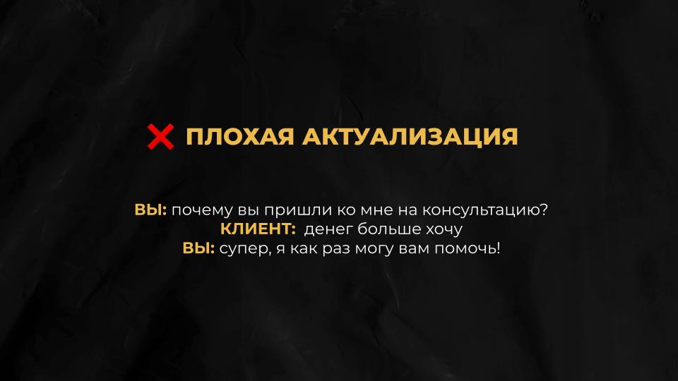 - Определить, почему нужно решить проблему именно сейчас. Задать клиенту такие вопросы: «Перед тем как начнём, хочу уточнить, почему вы решили обратиться ко мне / выделить время и прийти на встречу. Почему именно сейчас?»