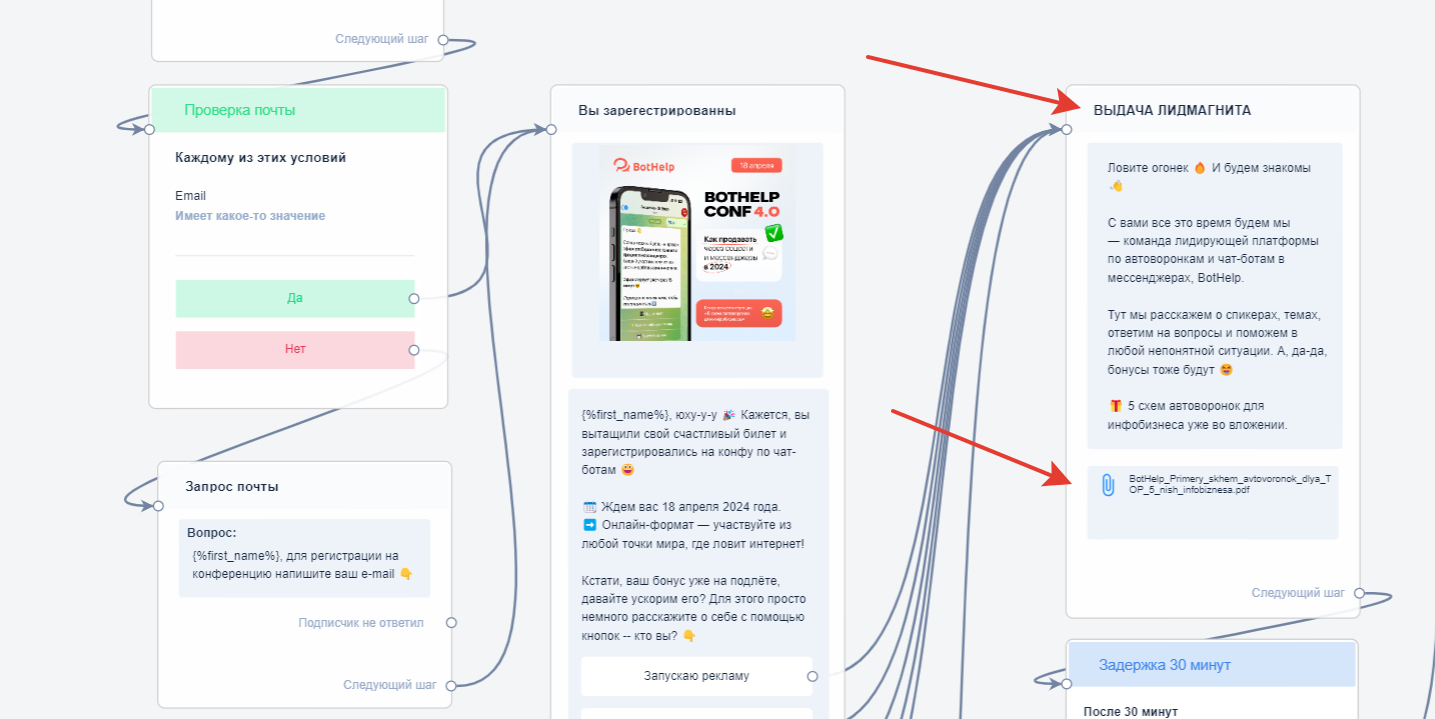 Пользователя ведут по этапам воронки, но не вручную, а автоматически, через сообщения в мессенджере. Чтобы реализовать эту схему, нужен чат-бот.
