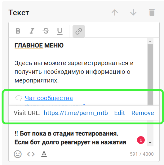 Изначально ссылку на чат участников мы добавили в кнопку бота, но из-за этого ссылка подменялась и открывалась в браузере. В итог подписчик из Telegram-бота попадал сначала в браузер, затем оттуда, обратно переходил в чат в приложении Telegram.