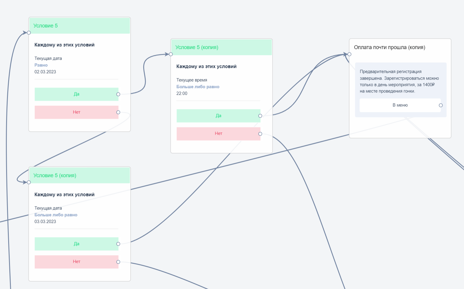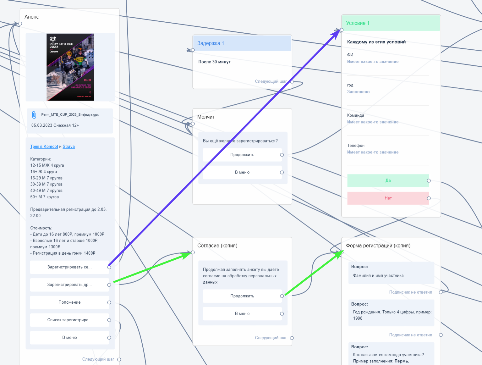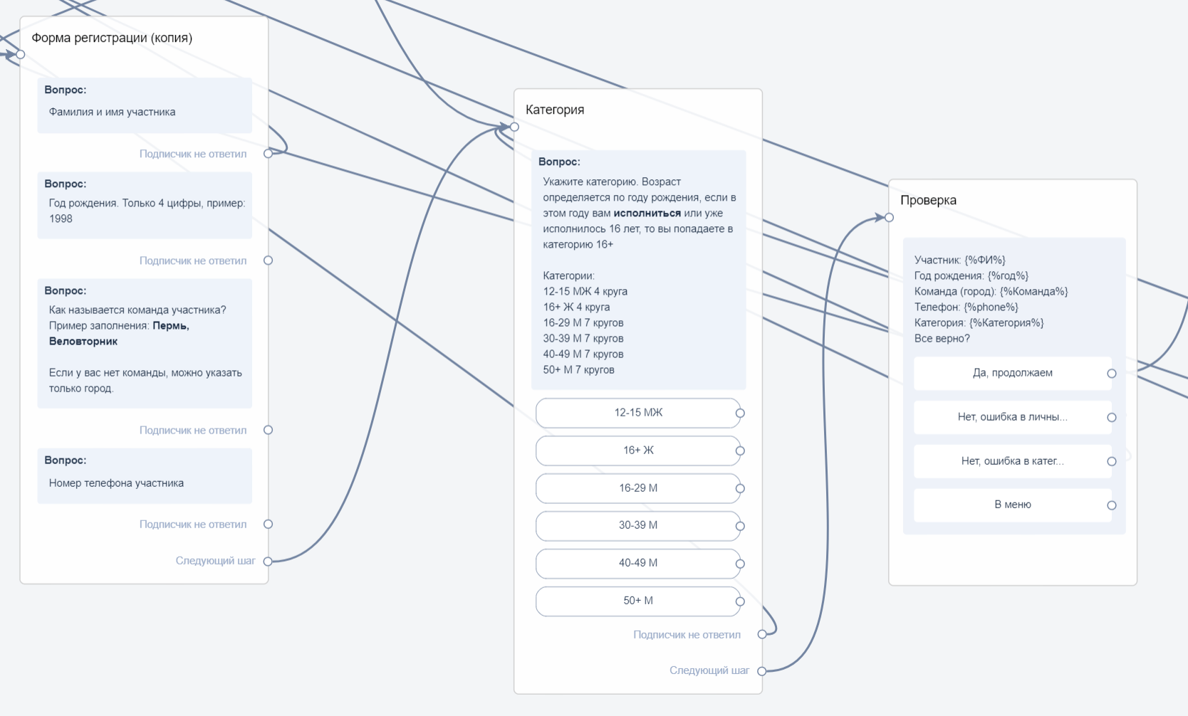 Так как гонки проводятся регулярно, перед анкетированием был добавлен блок «Условие», который проверяет, заполнял ли подписчик анкету раньше. Если данные уже есть, то подписчик сразу попадает на блок «Категория», чтобы не заполнять данные повторно.