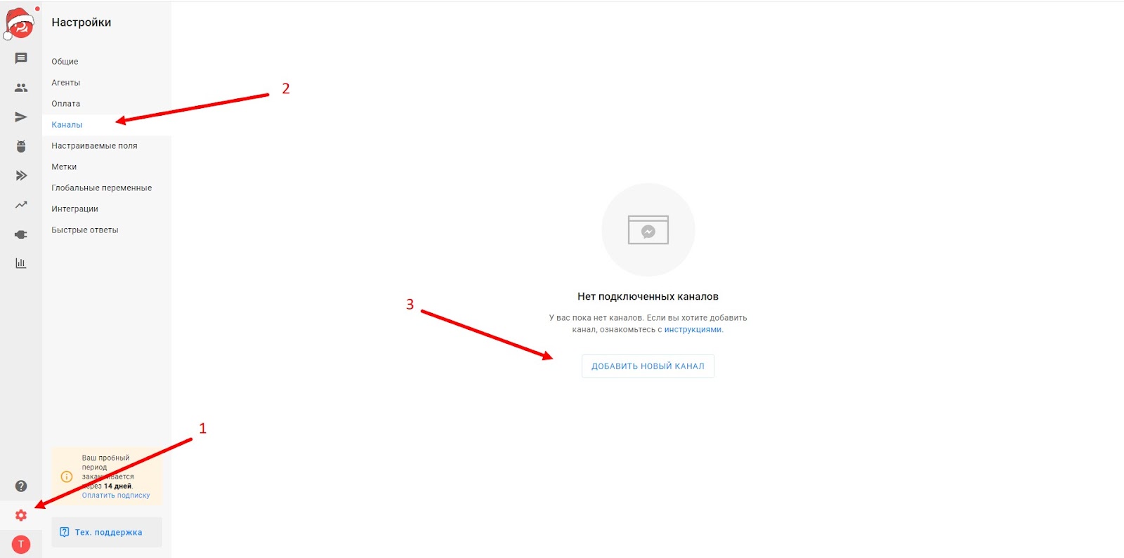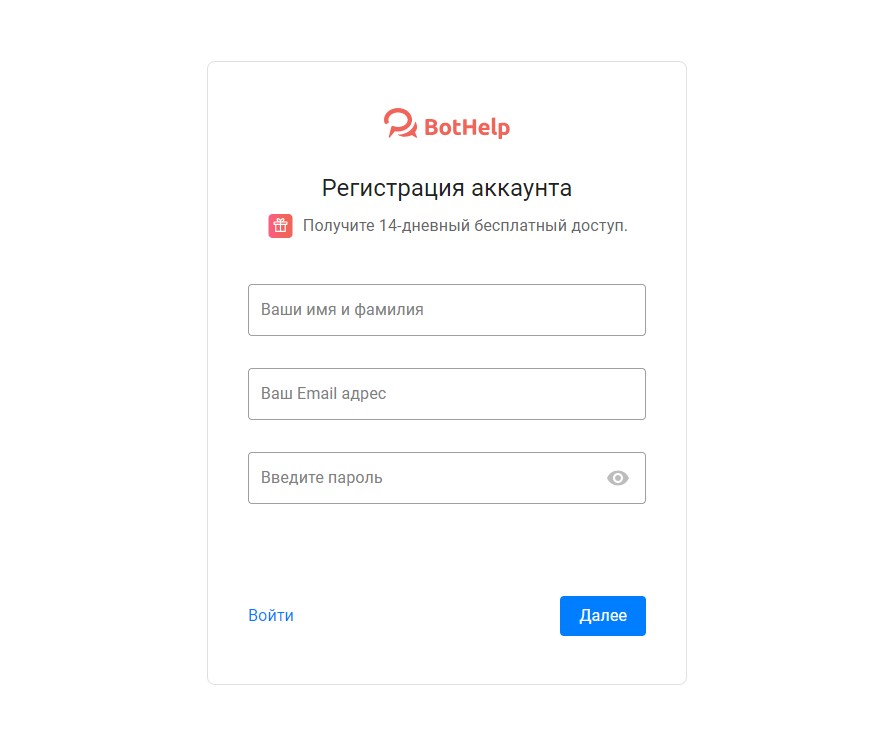 - Зарегистрируйтесь на BotHelp. У платформы есть тестовый период 14 дней с доступом ко всему функционалу.