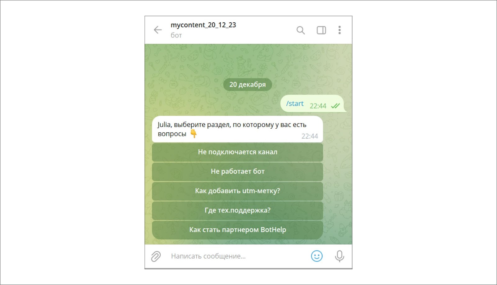 Легко, интуитивно, без знания кода и технических навыков. В BotHelp есть все для работы с чат-ботами: визуальный конструктор ботов, рассылки по базе подписчиков, сохранение данных пользователей для сегментации, интеграции с CRM и любой другой системой, отправка файлов, изображений, аудио, видео, голосовых сообщений.