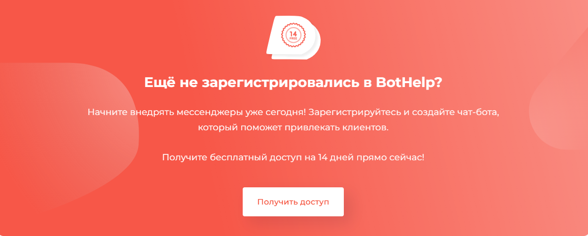 Например, у BotHelp есть бесплатный пробный период с доступом ко всем функциям платформы на 14 дней.