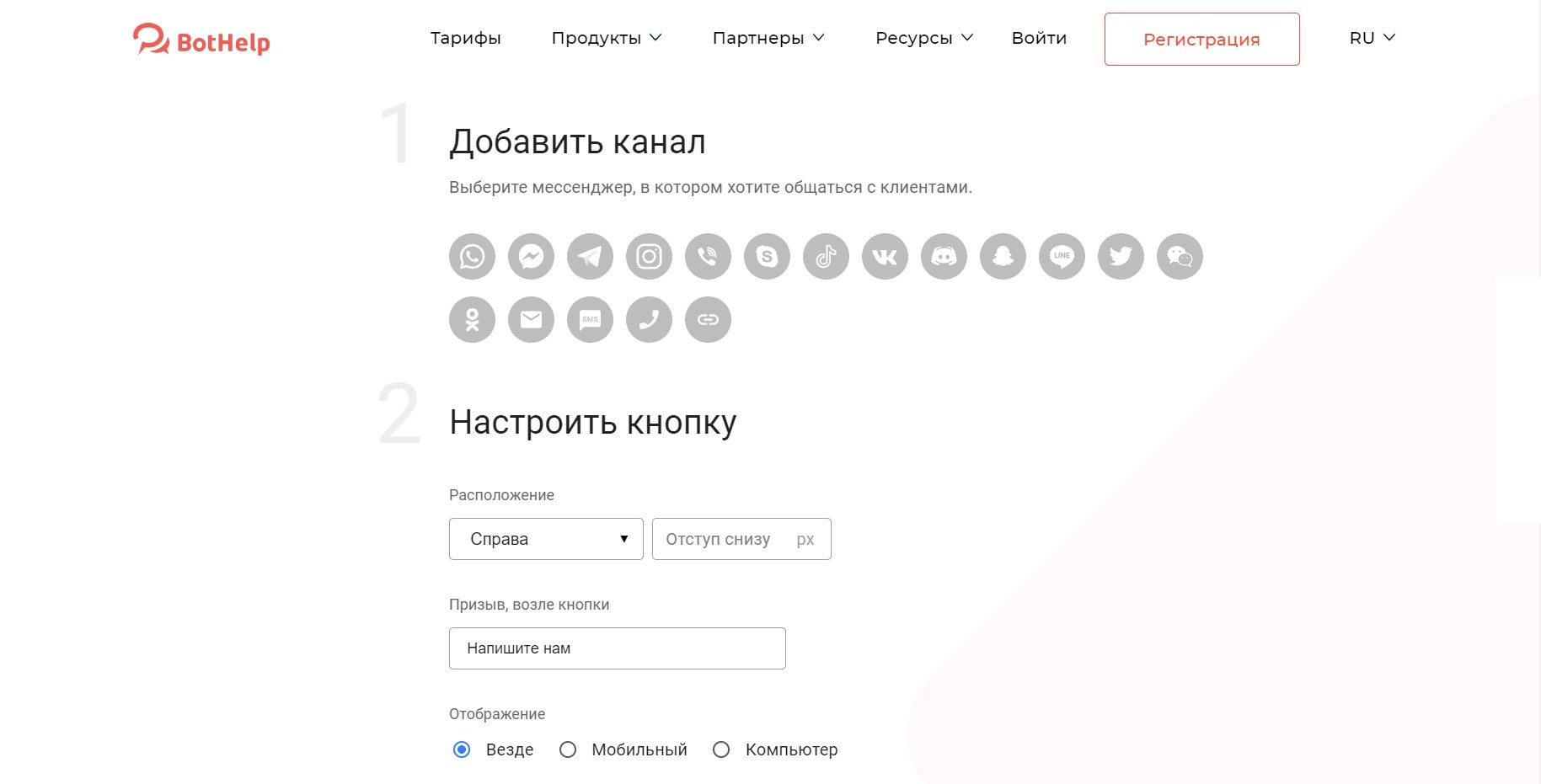 Установите бесплатную кнопку чат-бота на сайт и сразу же подключите выбранные мессенджеры к BotHelp, чтобы не потерять ни одного подписчика.