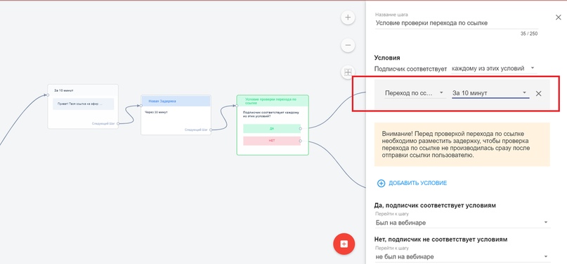 Чтобы отследить переход по ссылкам, необходимо добавить условие после сообщения с ссылкой и задержки (чтобы человек успел перейти по указанному url). В условии необходимо указать в каком шаге нужно отследить переход по ссылке, и куда будет направлен человека в случае соответствия или несоответствия указанному правилу.