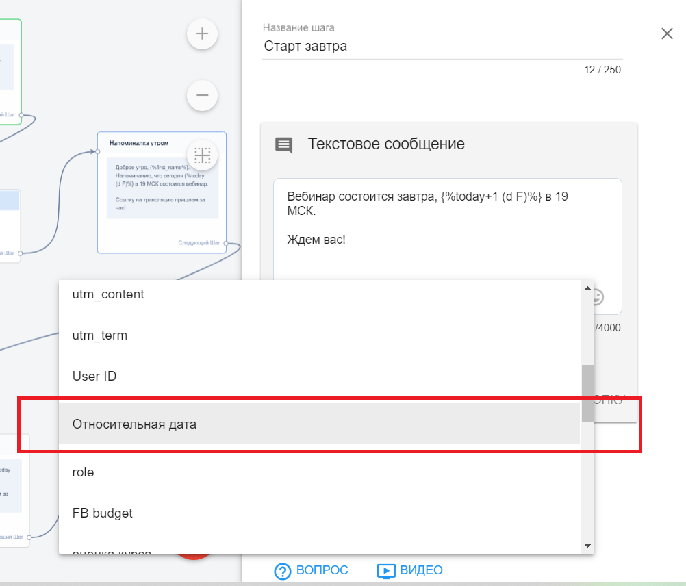 Это внутреннее приложение ВК, которое подключается к группе, и с помощью которого будут отправляться потом сообщения. Здесь также можно установить относительную дату, которая позволяет настроить разделение показа даты в зависимости от времени, когда человек попал на страничку.