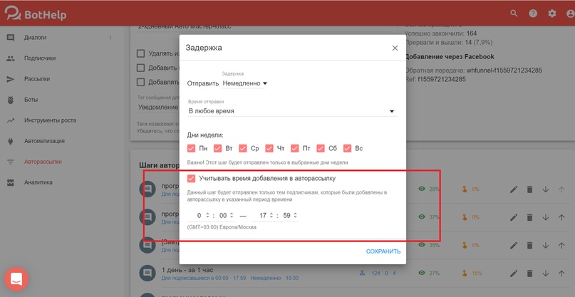 Если автоворонка, не рассчитана на сложные вещи, нет чат-ботов и вариативности, или необходимо быстро стартануть и с чего то начать, то отлично подойдет авторассылка. При настройке шага есть опция учитывать время добавления в авторассылку. Именно здесь указывается какому сегменту будет отправляться этот шаг.