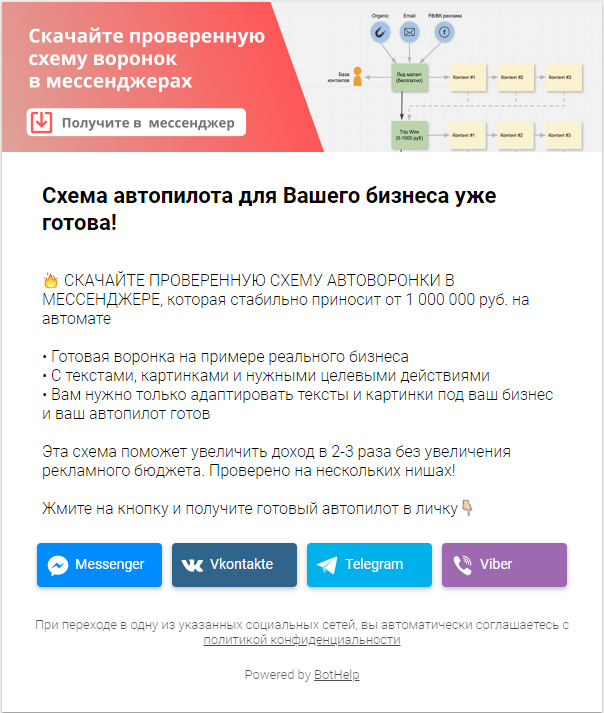 После того, как человек указывает свой e-mail и телефон, он попадает на следующую страницу и становится подписчиком еще и в мессенджере.