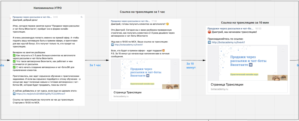 Таким образом, создается автовебинарная цепочка для мастер-класса, которая занимает максимум 3 дня.