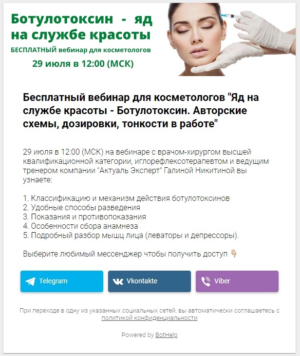 Посадочную страничку для регистрации на вебинар сделали на платформе BotHelp – быстро, легко и эффективно. Отправили ее в чат и получили регистрации.