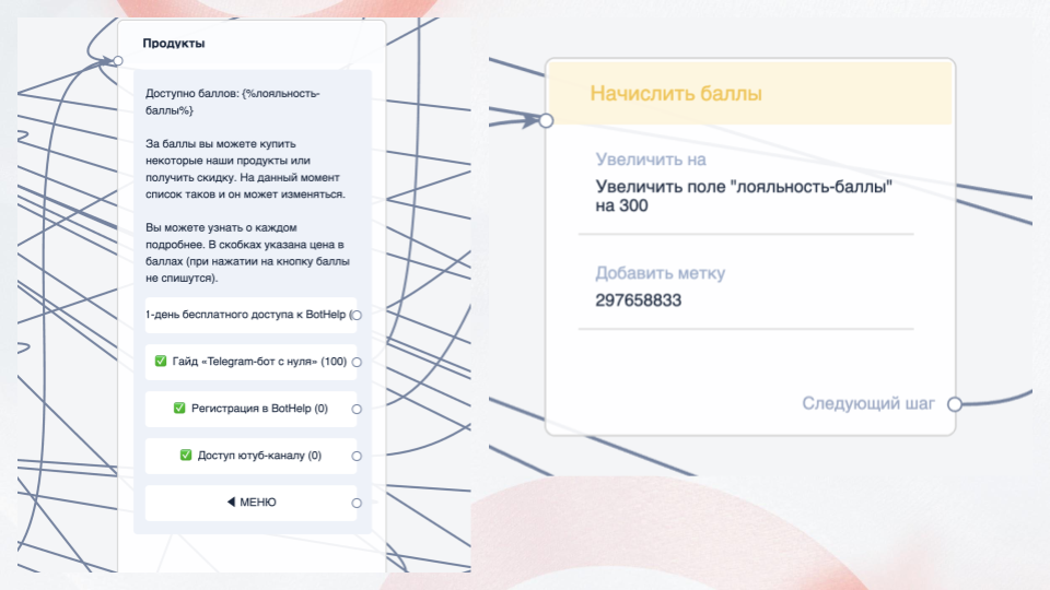 Вот так выглядит момент с начислением баллов в редакторе чат-бота в BotHelp: