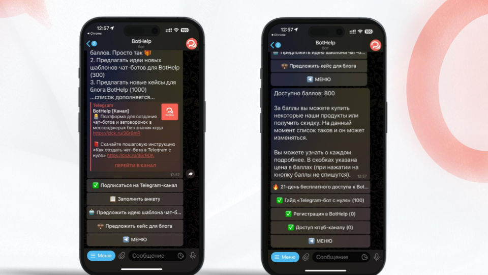 В боте подписчики выполняют определённые действия, например читают посты в Telegram-канале, заполняют анкету, оставляют контакты, и за это чат-бот выдаёт баллы.