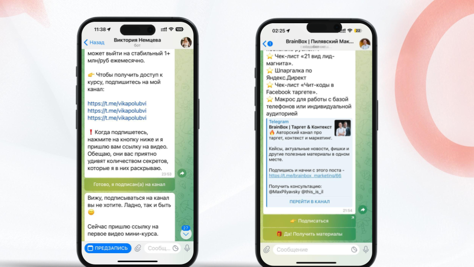 Если ваша задача — набрать подписчиков в канал по адекватной стоимости, то такая механика отлично работает. Продвигать в рекламе лид-магниты проще, чем подписку на экспертные каналы. И если сделать «прокладку» в виде чат-бота и обязательной подписки, то вы получаете подписчика гораздо дешевле.