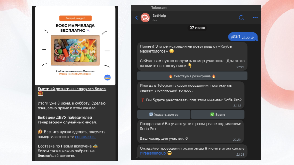 В чём ещё плюс чат-бота? Он проверяет участников на повторение: если пользователь уже получил номер, то обхитрить систему и получить ещё номер у него не получится.
