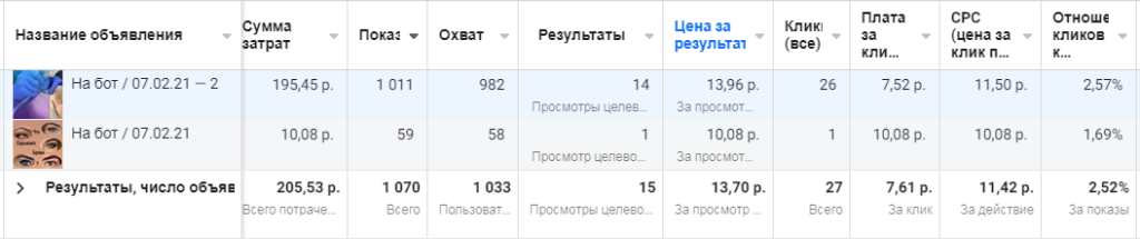 Клиент попросила остановить рекламу, так как были забиты все окошки для записи на ближайший месяц и некуда было записывать. На момент создания кейса окончательные результаты не известны, так как процедуры планируются в течение ближайшего месяца. Рекламу на бот решили запускать каждый месяц.