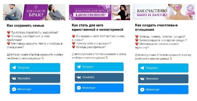 Сначала мы сегментируем женщин по группам: пока одна, в браке, в отношениях, в разводе. В зависимости от выбранного ответа ведем на тест в три вопроса, и высылаем полезное видео от Галины Ткаченко, причем видео индивидуально для каждой группы.