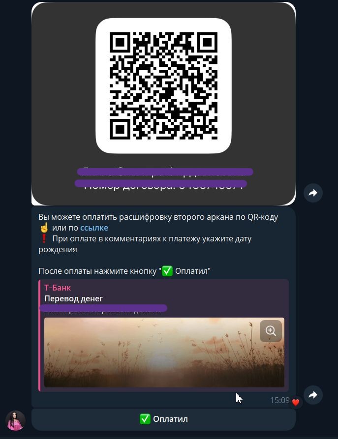 Для оплаты пользователю предлагается ссылка или Qr-код. После оплаты пользователь должен нажать кнопку «Оплатил»: