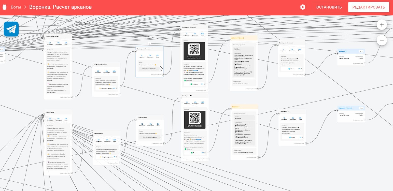 - В результате был сделан бот-воронка для таролога, который плавно подводит к покупке основного продукта клиента через лид-магнит — расчёт арканов по дате рождения через гугл-таблицу с бесплатной выдачей расшифровки арканов и трипваера — более подробной расшифровки арканов за небольшую стоимость;