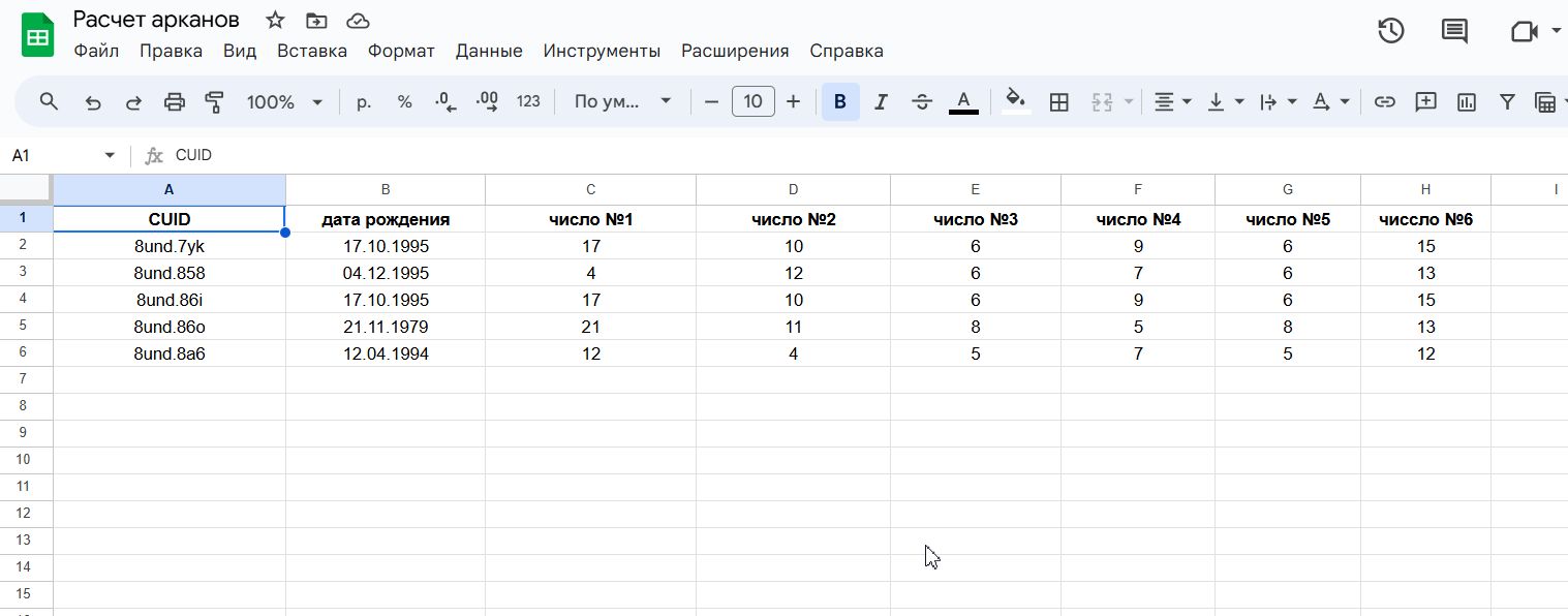 - настроить расчёт арканов по дате рождения через гугл-таблицу;