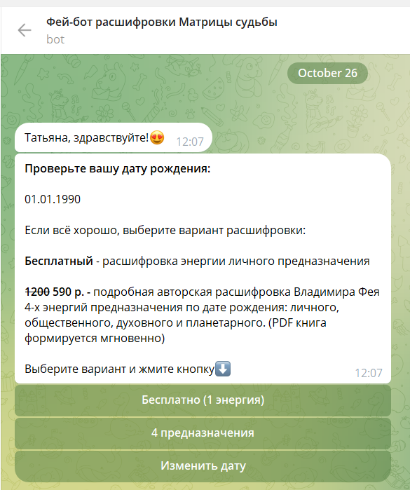 - При нажатии на кнопку подписчик попадает в бота по расчёту предназначения. При этом из калькулятора передаётся дата его рождения, чтобы подписчик не вводил её заново. Если же клиент попадает в бот не из калькулятора, то бот просит ввести дату рождения и производит проверку правильности формата ввода даты.