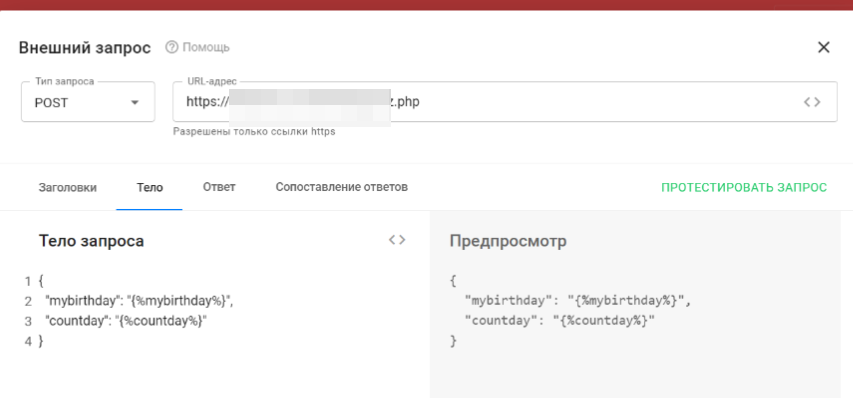 Проверка правильности формата даты рождения и расчёты по дате рождения производятся с помощью программы на внешнем хостинге. Для этого была настроена отправка и приём данных с помощью функции «Внешний запрос».