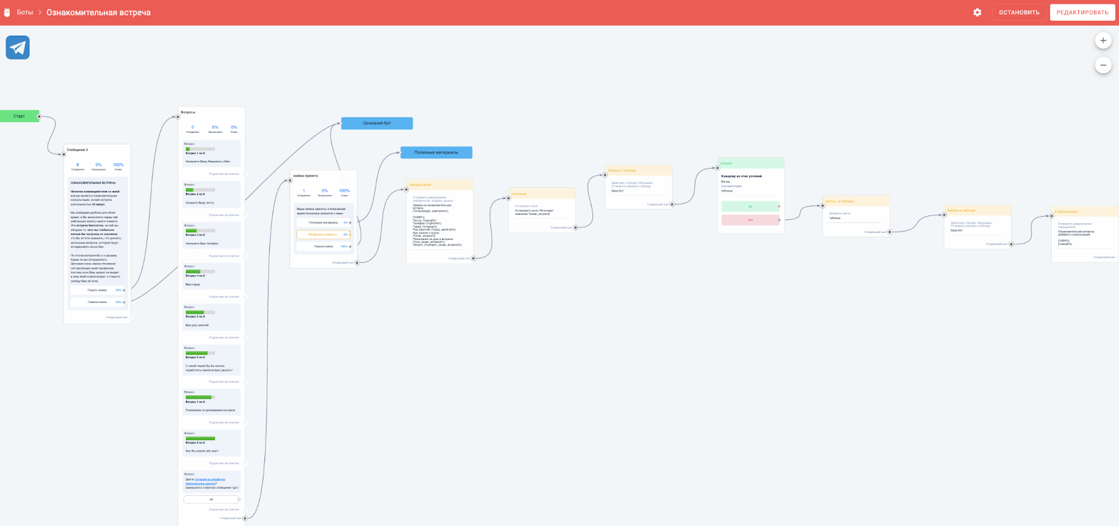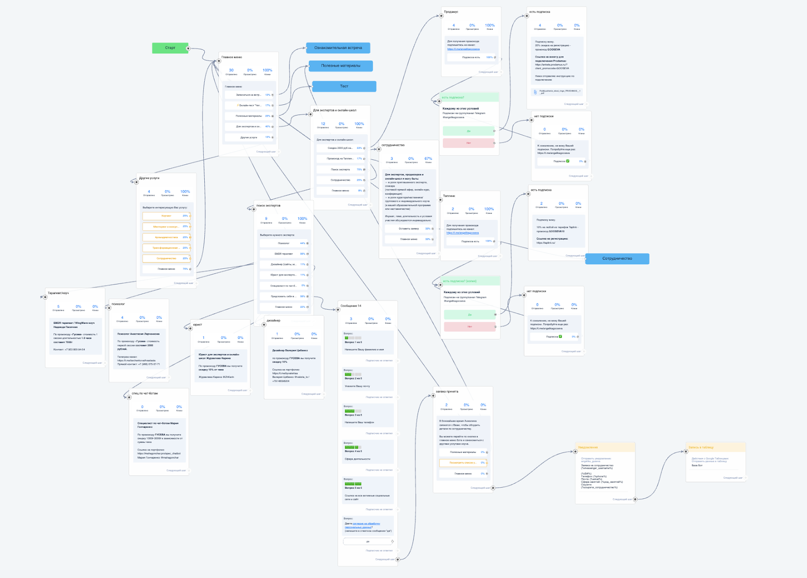 1) Был составлен подробный план, который включал несколько воронок через онлайн-майнд-карту Miro. Тезисно прописаны тексты, проверки, где должны были приходить уведомления, передаваться данные в таблицу. Таким образом, эксперт мог вставить нужный текст, согласовать воронки/действия/шаги пользователей и сделать соответствующие правки.