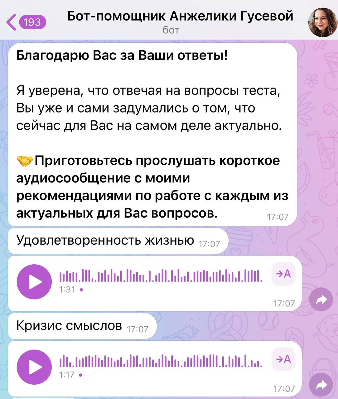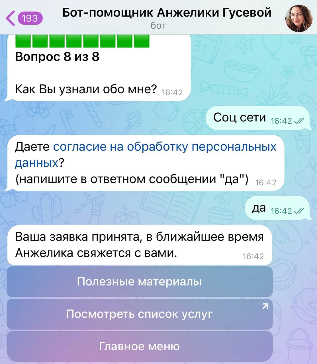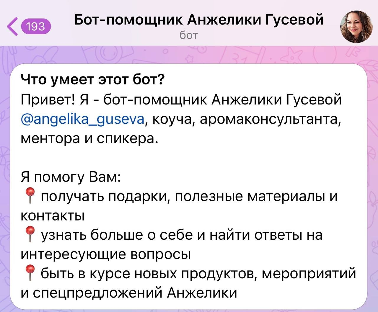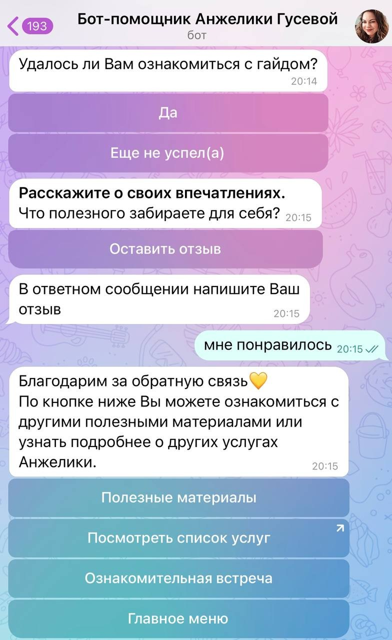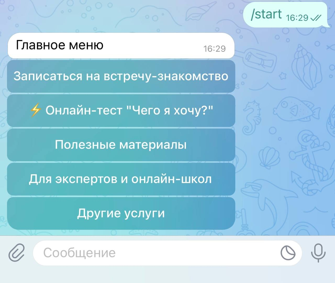 Чтобы пользователи сразу видели всю информацию об эксперте, видели все продукты, смогли записаться на консультацию, оплатить услуги, узнать контактную информацию, я предложила Анжелике сделать БОТ-ВИЗИТКУ.