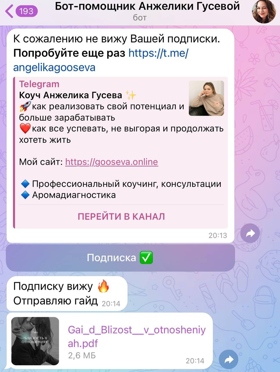 Для получения бесплатных полезных материалов была настроена проверка подписки на основной канал. Если пользователь подписывается на канал, то выдаётся гайд.