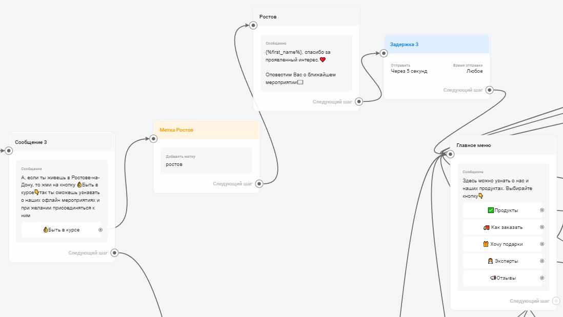 Для приглашения на офлайн-мероприятия был создан бот-дублёр. Он автоматически ставил метку участника мероприятия «Ростов» тем, кто сканировал специальный QR-код, выданный на визитках. Это позволило собирать аудиторию для дальнейших событий без необходимости дополнительных действий со стороны участников.