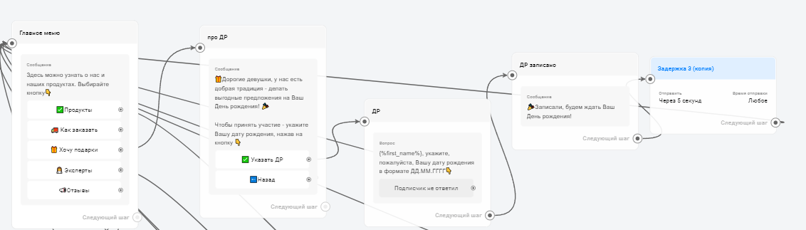 - Подарки и мероприятия: в боте клиенты могли указать дату своего дня рождения, чтобы получить подарок, а также подписаться на приглашения на офлайн-мероприятия.