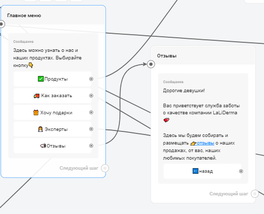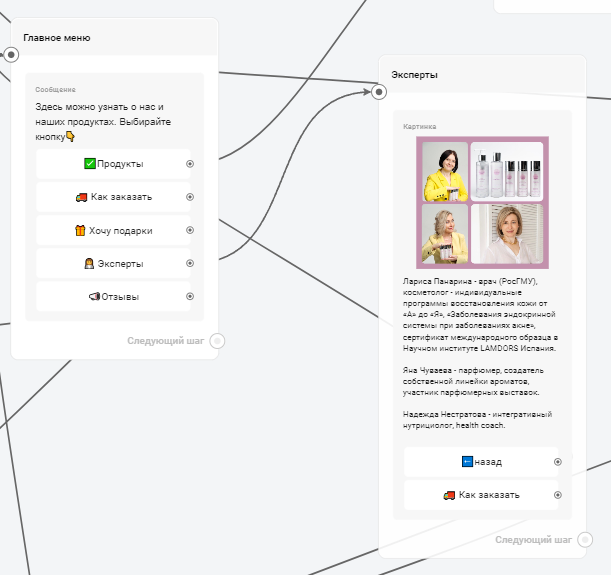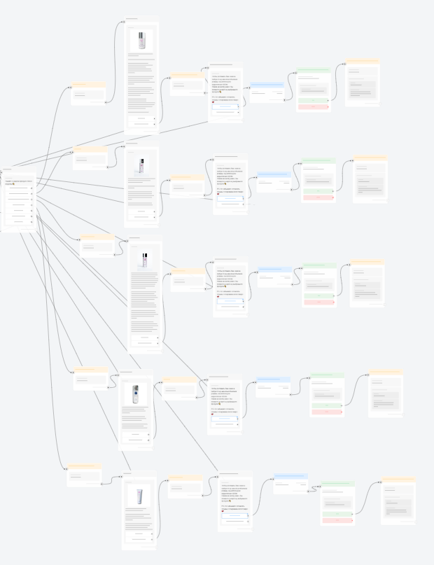 Для решения поставленных задач был разработан бот-визитка со встроенной автоворонкой. Этот бот знакомил пользователей с брендом, продуктами, экспертами и отзывами. Пользователи могли получить подробную информацию о каждом продукте и перейти в маркетплейс для покупки.
