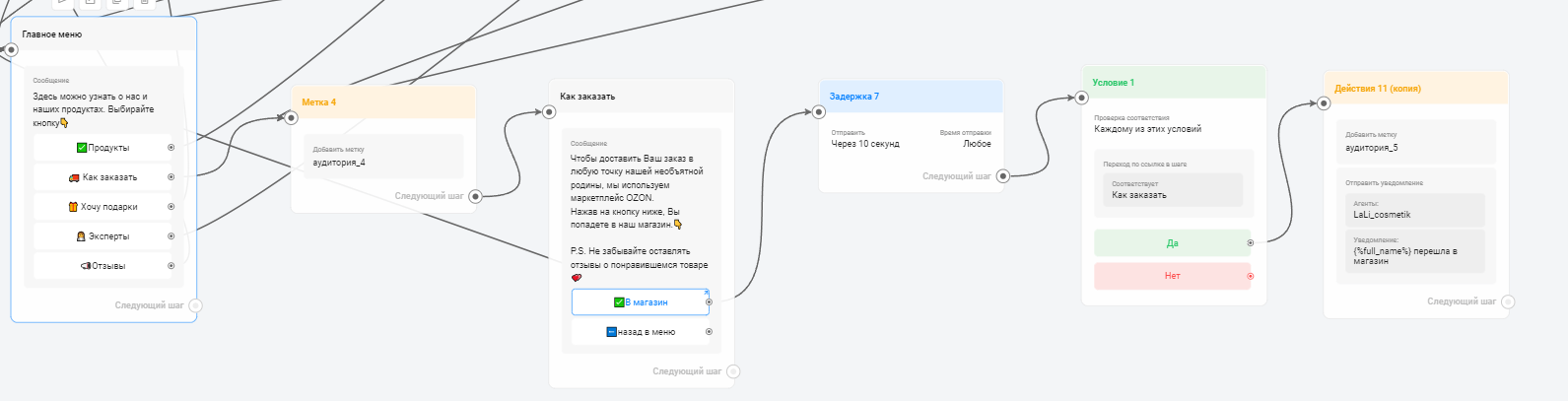 - Персонализация и метки: в боте каждому клиенту по степени его заинтересованности автоматически проставлялись метки. Это позволяло отправлять целевые рассылки и предложения.