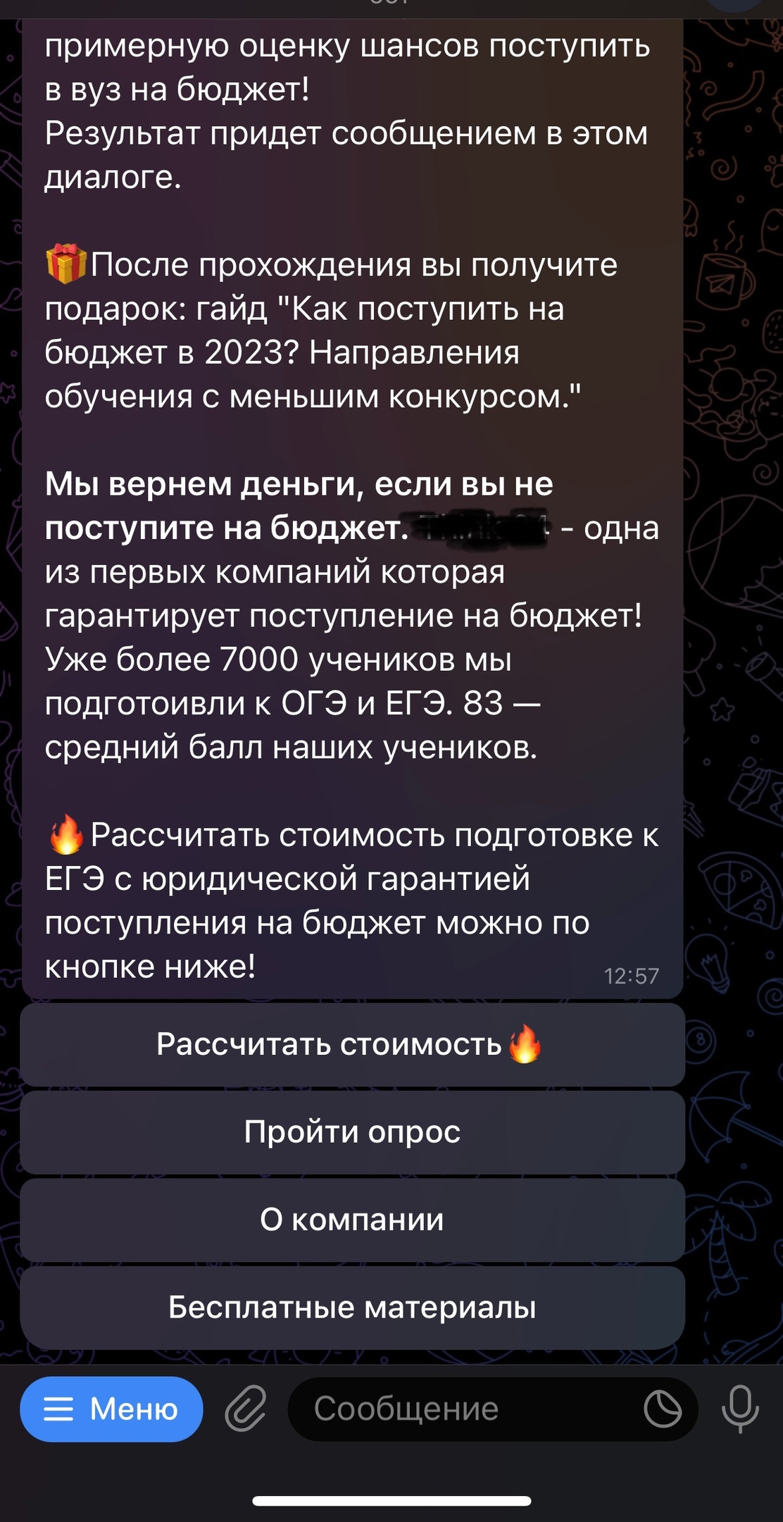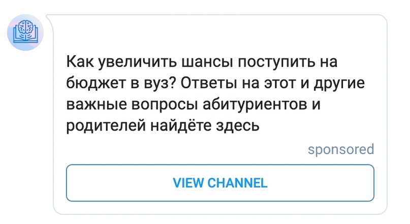 Поэтому мы приняли решение сделать чат-бота и вести в него трафик с Telegram Ads. В теории это поможет получать не только подписки, но и заявки на курсы по ЕГЭ. Так как мы сами контролируем путь клиента и контент, который он потребляет внутри бота.