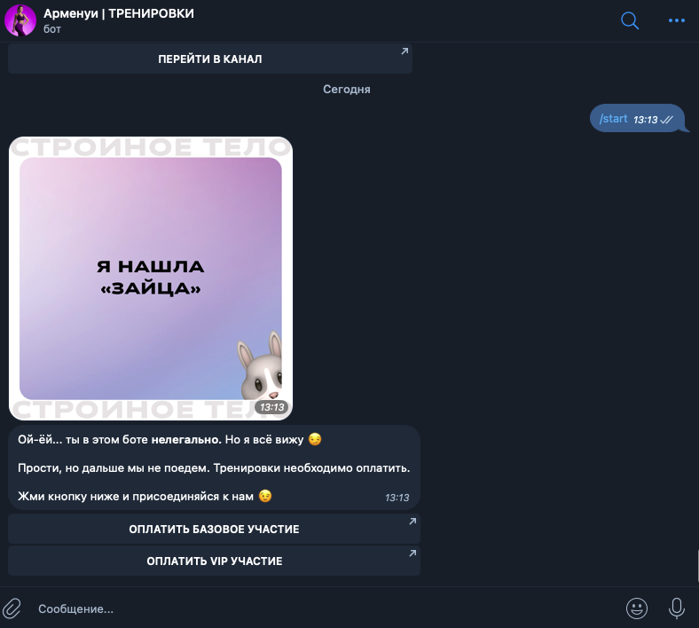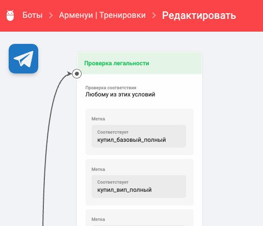 Мы её назвали «Проверка легальности». При входе в бота происходит проверка меток. Если человек не оплатил, дальше он не пойдёт.