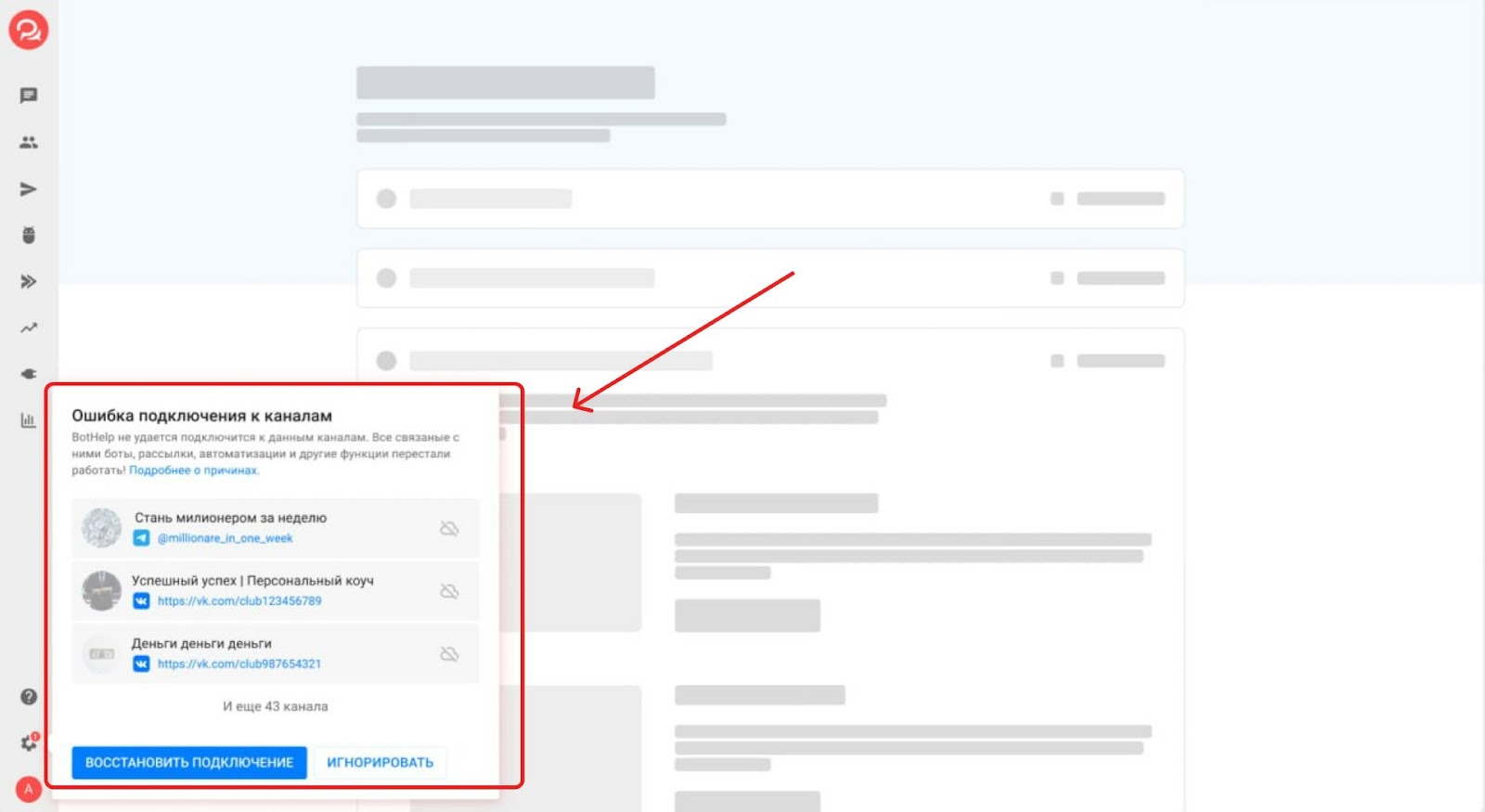 Теперь мы предупреждаем о самопроизвольном отключении каналов от BotHelp. Вы увидите уведомление при попытке использовать отключённый канал в любой части кабинета.