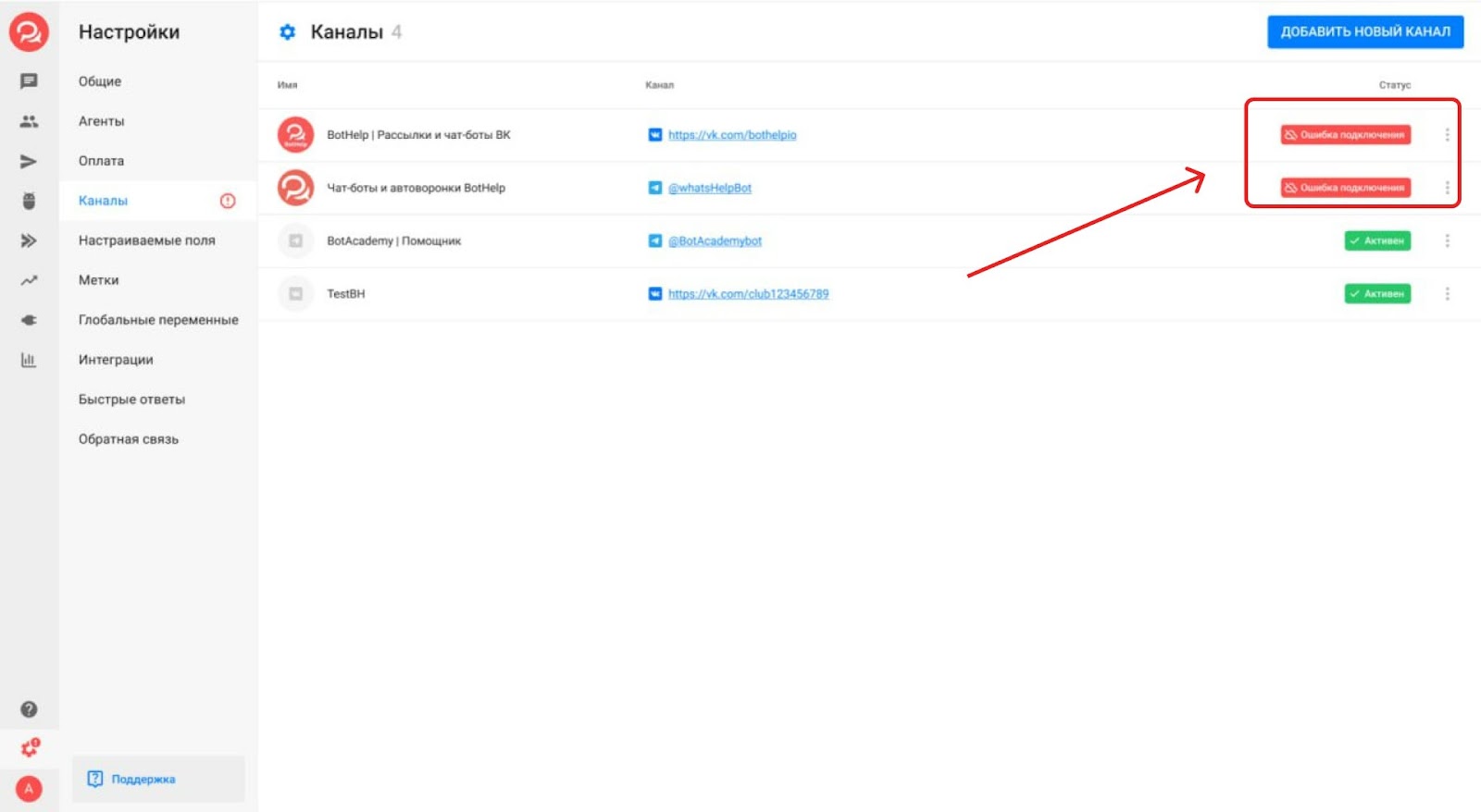 Нажав на плашку «Ошибка подключения», вы сразу перейдёте в раздел «Каналы» и сможете его переподключить. А для Telegram теперь достаточно просто повторно ввести токен.