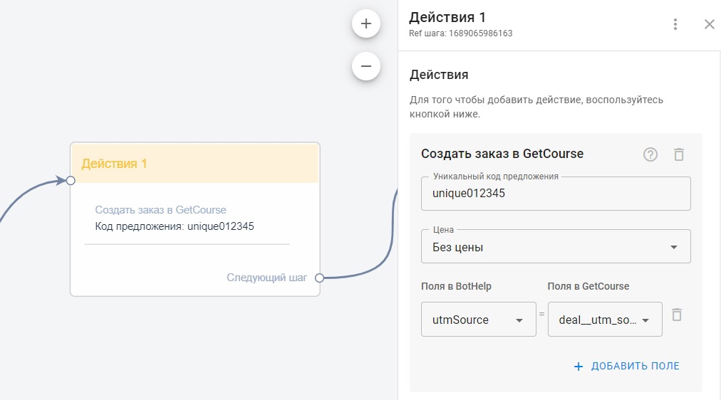 Теперь прямо из конструктора ботов через блок «Действие» можно автоматически создавать заказ в GetCourse.