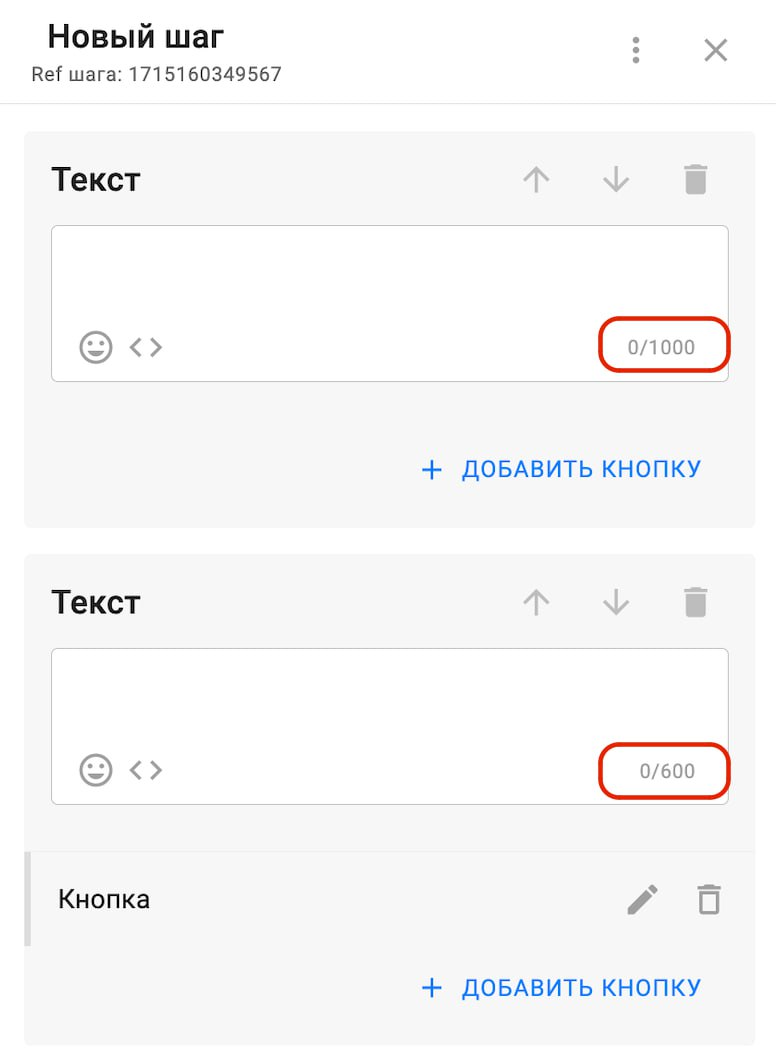 3) Обновили лимиты количества знаков для карточки «Текст» для Instagram-ботов*. Если в карточке нет кнопок, то можно вводить до 1000 знаков, если добавлена хотя бы одна кнопка, лимит остаётся 600 знаков.