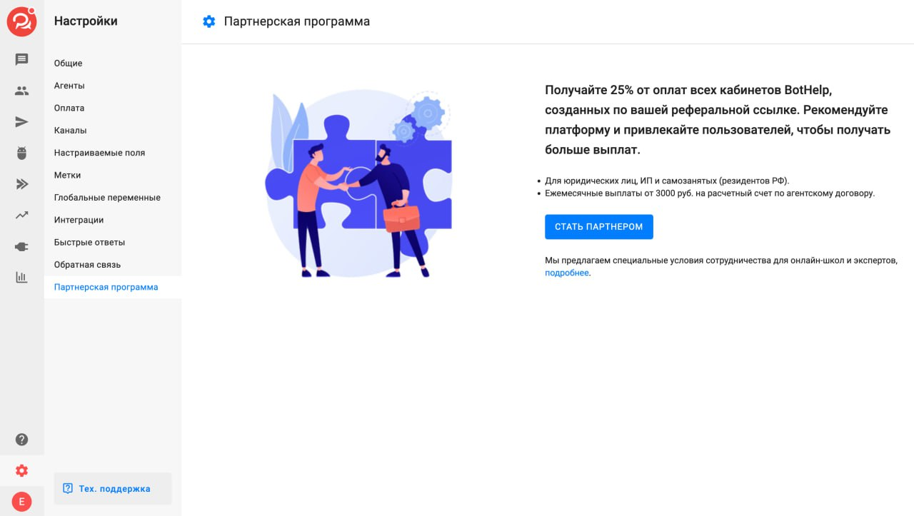 2) В разделе «Настройки» добавили страницу «Партнёрская программа». Теперь стать партнёром BotHelp ещё проще.