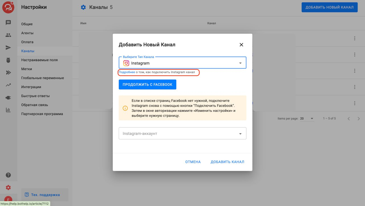 4) При подключении канала в Instagram* и при импорте подписчиков добавили ссылки на инструкции в «Базе знаний», чтобы вам было удобнее в один клик обратиться к ней.